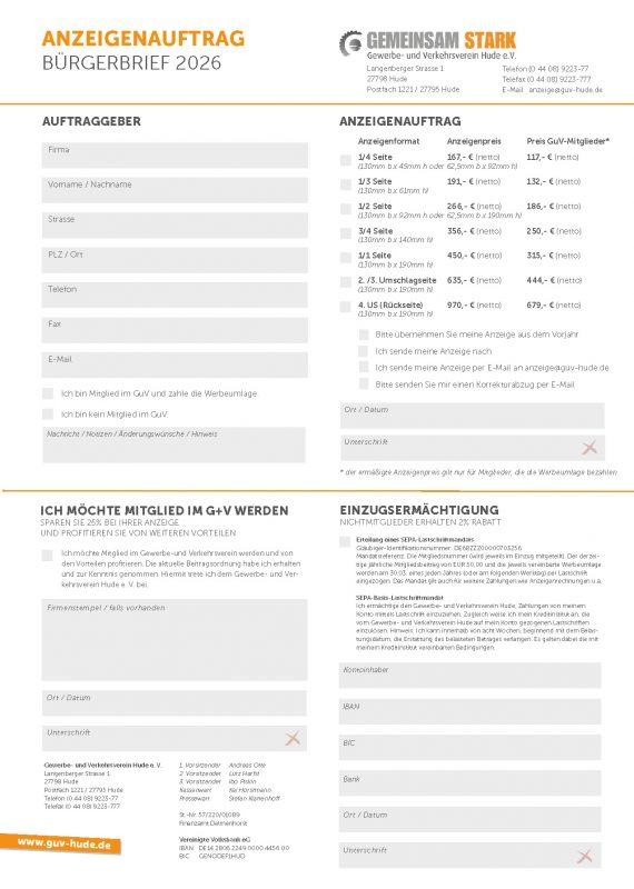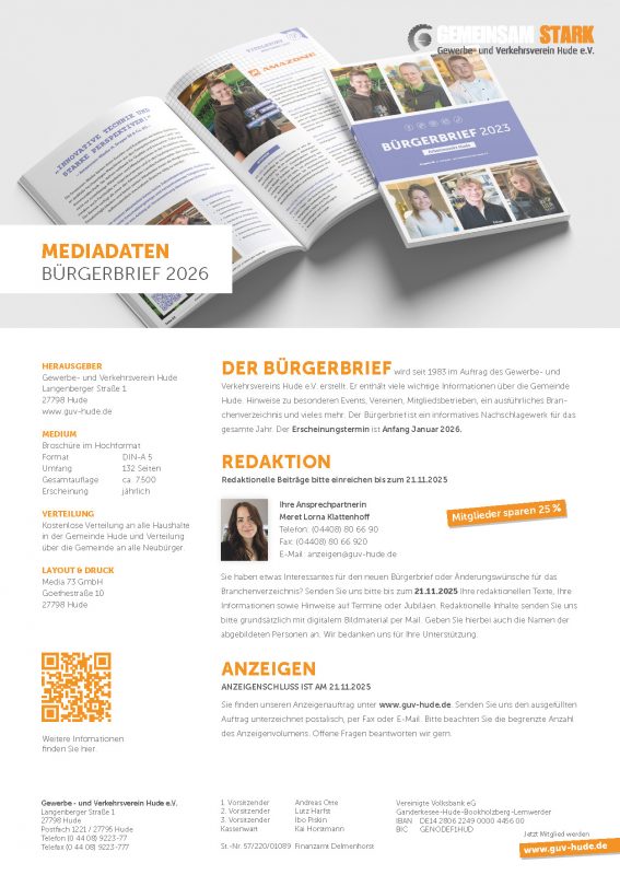 Der „Huder Bürgerbrief“ erscheint seit 1983 einmal jährlich im Auftrag des Gewerbe- und Verkehrsvereins Hude e.V. und steht ab Januar auch online zum Download bereit. Redaktionsschluss für die Ausgabe 2026 ist Freitag, der 21.11.2025.